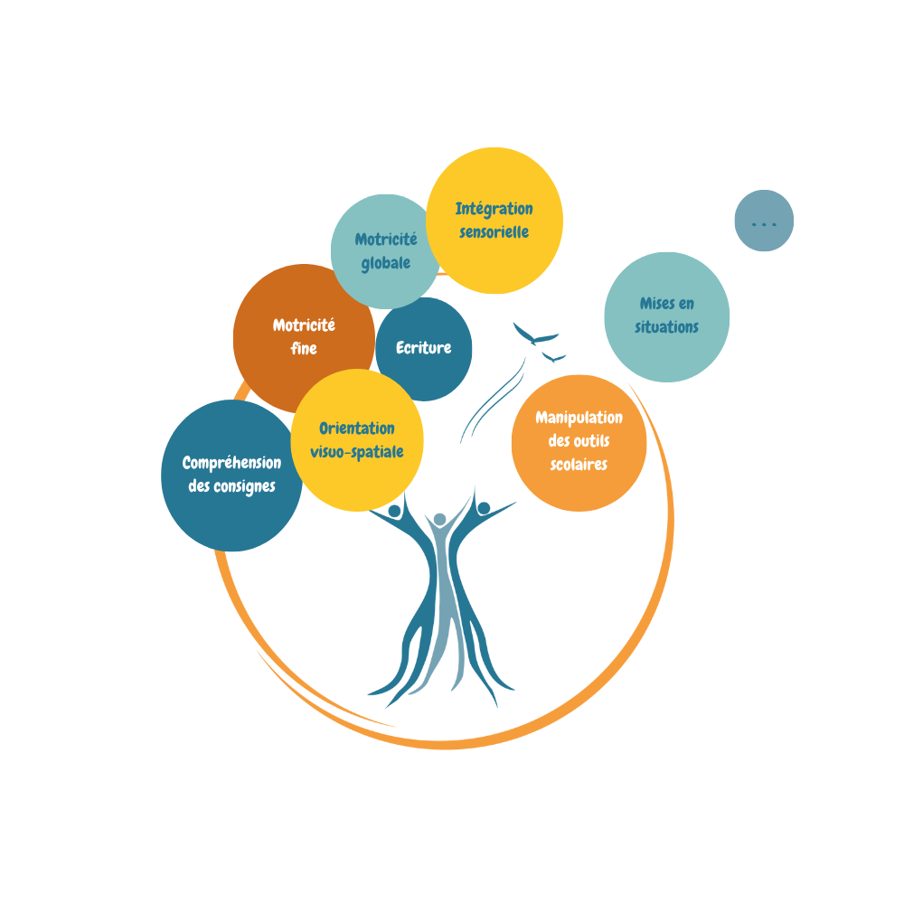L'ergothérapeute travaille en collaboration avec l'ensemble des personnes qui gravitent autour de l'enfant(famille, école, santé).